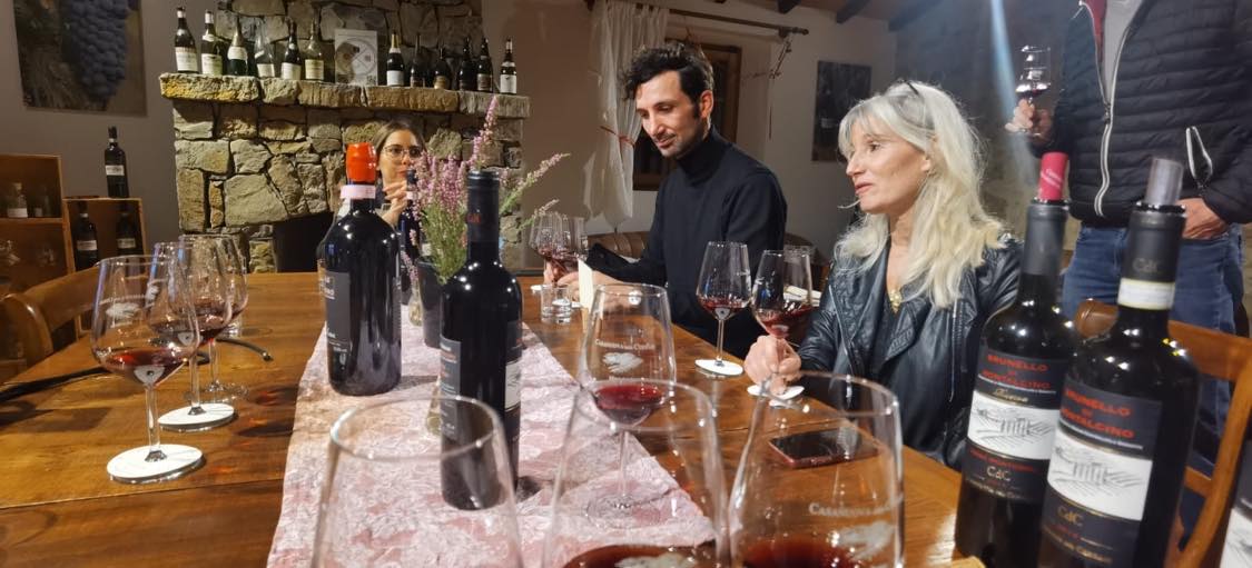 “I colori caldi e gentili delle poche foglie ormai rimaste sulle viti mi rimandava alla fugacità delle cose, allo scorrere del tempo: l'incontro con Jessica e con gli amici conosciuti grazie ai social, ma scelti perché speciali, mi ha riportato al presente, alla bellezza di ogni momento, al tempo da condividere. Montalcino è per me speciale, un mondo a parte, dove più che mai riesco a vivere il sentimento di immensa gratitudine nel rosseggiare dei suoi Tramonti e nella bellezza di un calice di vino."